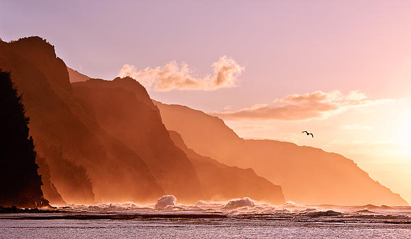 A beautiful image of the Na Pali coastline on the Garden island of Kauai with a dramatic sunset enhanced by a bird flying in the winds off the rugged coast.